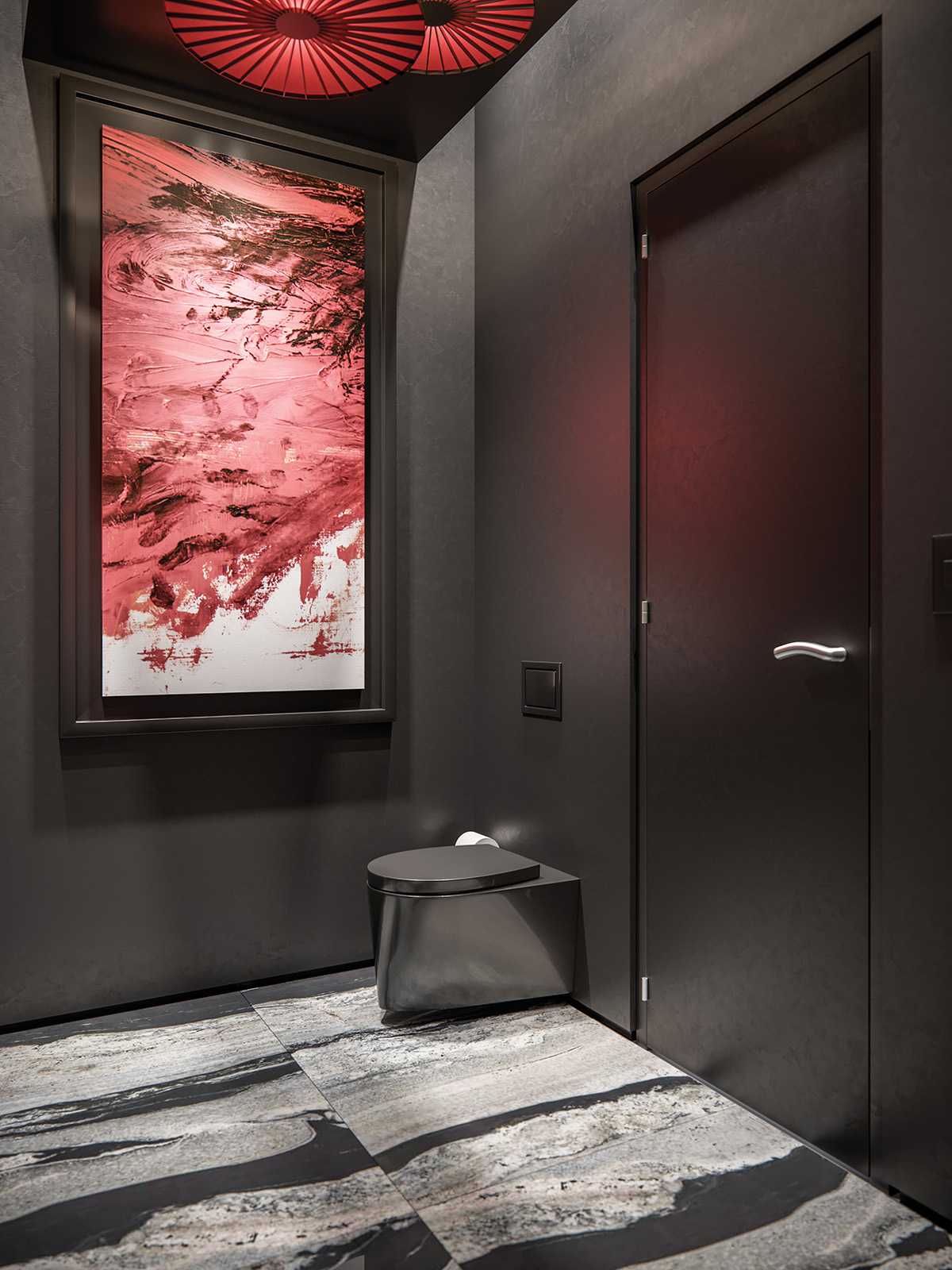 The room featured tall and narrow dimensions, creating drama with its soaring ceiling height but also necessitating creative space-maximizing solutions. A striking red modular lighting fixture laid the groundwork for an opulent theme that would still harmonize with the rest of the home, centering the palette on vibrant reds and drawing inspiration from the fixture’s geometric elements.