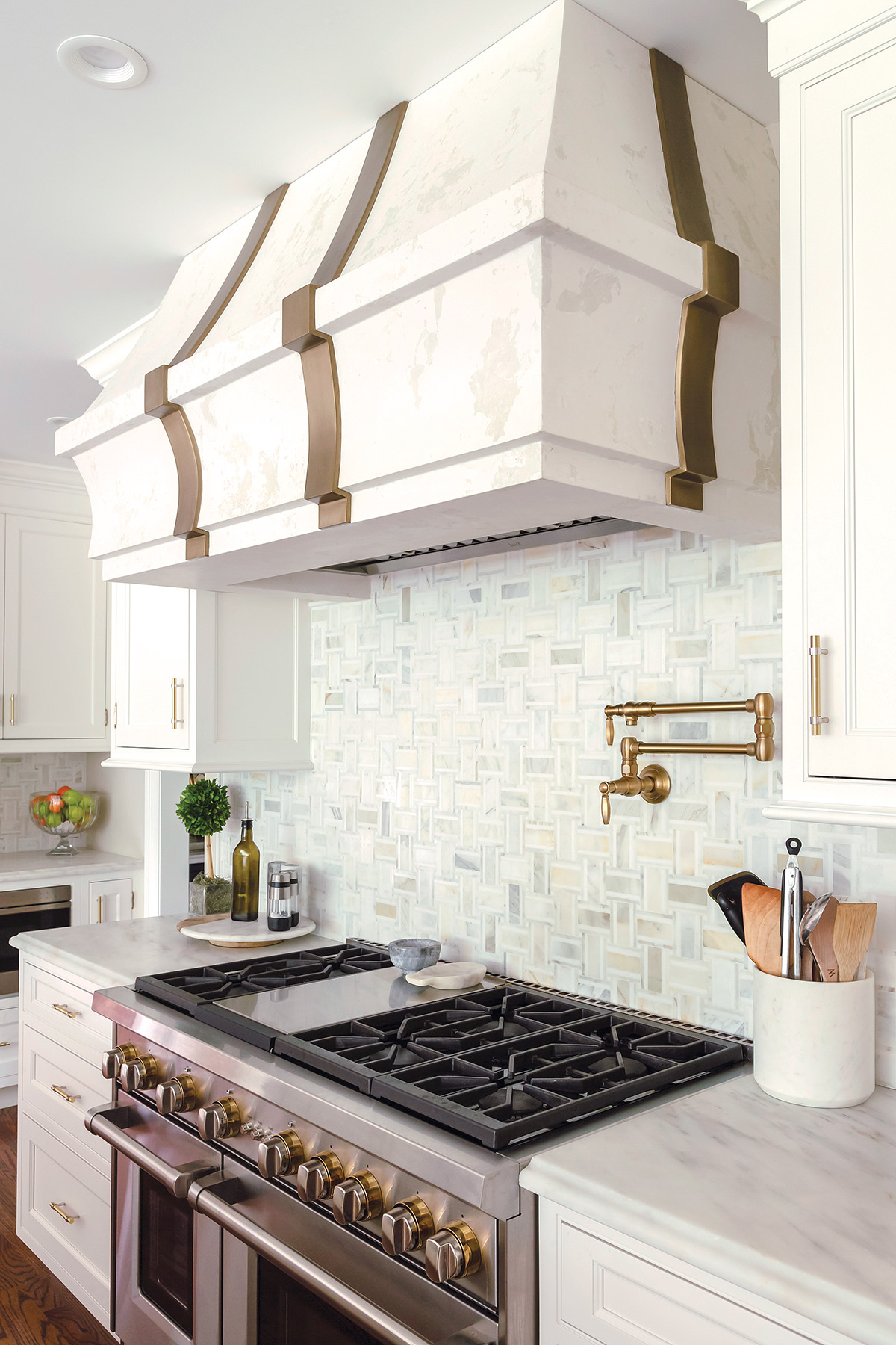 The white hues of the cabinets and countertops are repeated in the Calacatta marble backsplash, which is laid in a basket weave pattern to highlight the variety of whites, creams and grays throughout the stone.