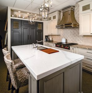 To ensure a relaxing visit, they included plenty of quiet places to ponder. For example, the front and rear foyers are fully decorated and furnished with couches, club chairs and smart TVs to replicate a living room environment. In addition, designers included planned seating within many of the displays, such as at islands or on window benches. And when it comes time to fully plan a client’s new kitchen or bath, each designer has a quiet, private work station where he or she can show their space rendered in 3D.