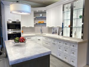 “This allows our customers to choose cabinetry based on their budget,” he says, noting that a popular display in the Glenview showroom is designed around the company’s most modestly priced cabinet line. “This display is special because it shows people they don’t have to spend a fortune on their new kitchen. There is a lot we can do to make a space beautiful with economical, straightforward cabinets.”