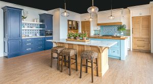 This kitchen display in Lakeville Kitchen & Bath’s new showroom features a mix of white, wood and painted cabinetry accented with a striking blue glass tile backsplash.